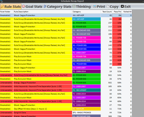 Additionally, you can benefit from learning how to read your schedule recap report (Dataset, Schedule, Recap Report). In this recap report, you can sort the pass percentage column by descending order, which shows me the rules that had lowest percentage of songs that pass any given active rule (both breakable and unbreakable). Watch out for unbreakable rules that have a low pass percentage, it indicates problems with that category’s ability to tolerate the current rule setup.